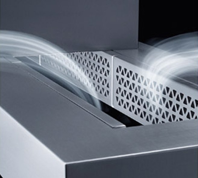 Due to the suction at the edge of the hood glass (edge extraction), a current is generated just below the ceiling, which flows toward the hood due to the use of innovative technology. Fumes and vapours rise upwards due to their own thermal dynamics, are collected there by the circulating flow and picked up by the ceiling-mounted model.