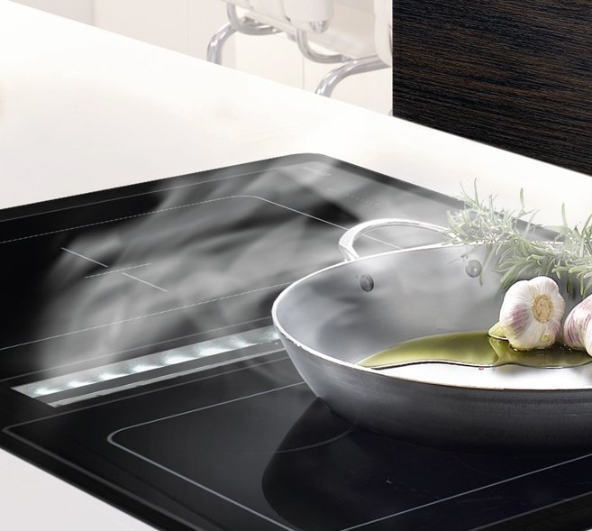 The vapours formed during cooking are extracted over the full surface i.e. from all sides. This extraction method is particularly advisable for devices with high vapour volumes.