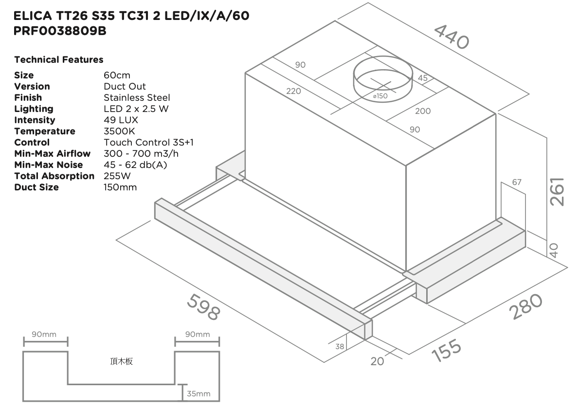 All the technical data are based on manufacturer Italy 🇮🇹 Elica latest catalogues or data sheets, The airflow data is measured by factory lab. at the motor outlet point MAMOP* it is a Free Motor Blower Value measured at the motor outlet point (MAMOP*) the EU testing method with long exhaustion tube and measure at the end of exhaust point, All the cooker hoods and appliances specifications are subject to stock model specifications or factory latest update. Please check the final offer from our quotation or offer to confirm the final specifications.